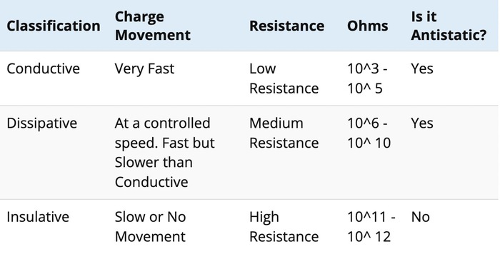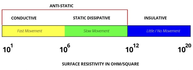Difference Between Conductive, Dissipative, Insulative and Antistatic![]() Difference Between Conductive, Dissipative, Insulative and Antistatic For ESD control purposes, materials are classified by how quickly electricity moves through the material. The speed is referred to as the “resistance” of the material i.e. how strongly the material resists charge movement. The speed is measured in Ohms and is typically displayed in powers of 10 (example 10^3). The lower the number, the more conductive the material and may be considered “Antistatic”.